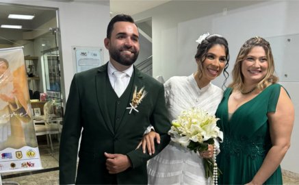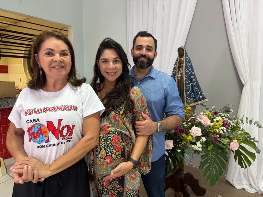 Em um momento de fé e devoção, os futuros papais posaram para o registro emoldurados pela imagem de Nossa Senhora Aparecida, acompanhados pela carinhosa vovó Loudinha Lemos, uma das voluntárias da instituição.