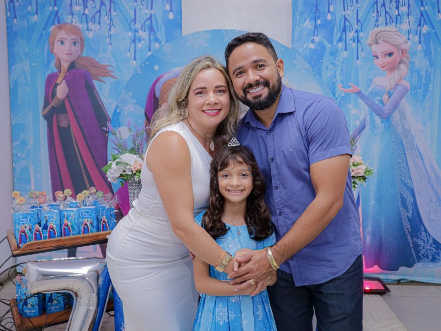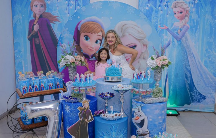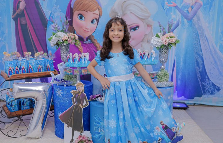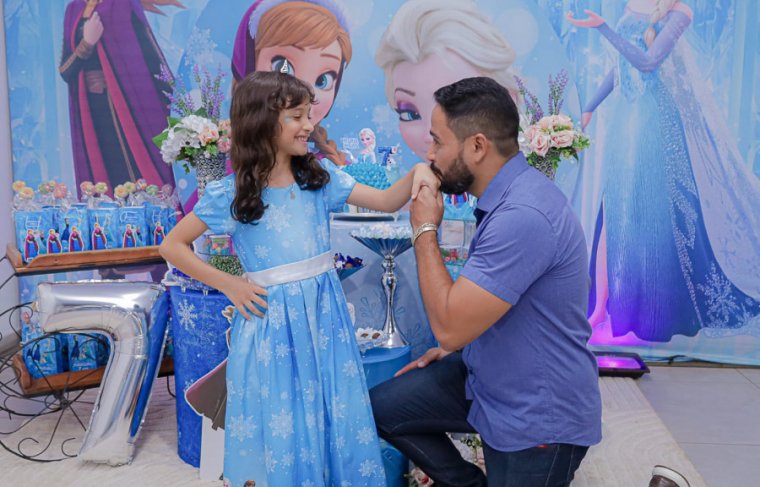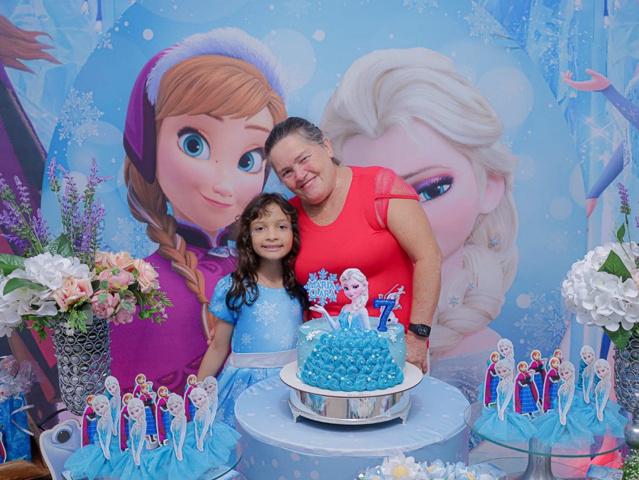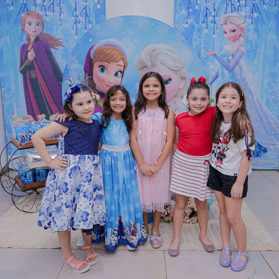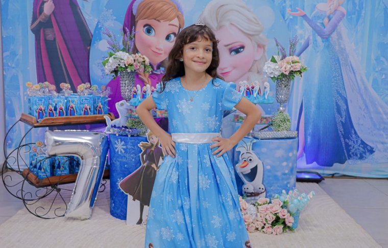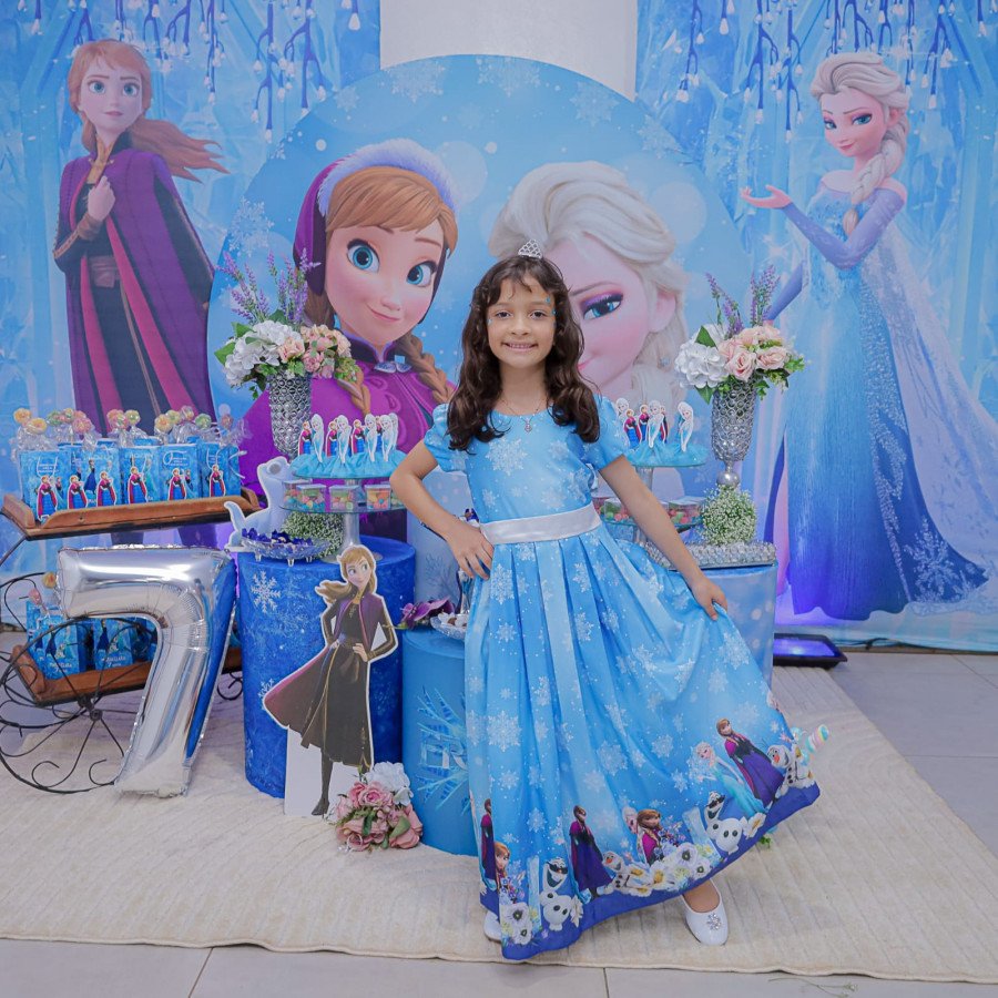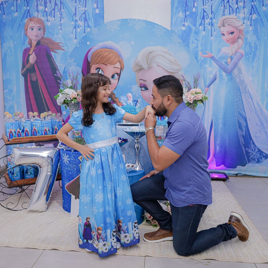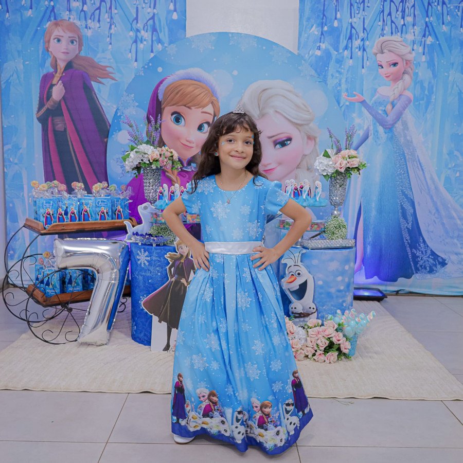 Inspirada no universo de Frozen, a pequena surgiu deslumbrante, como uma autêntica princesa de Arendelle. O look escolhido? Um longo azul impecável, salpicado de flocos de neve e com as icônicas personagens do filme adornando o barrado. Para completar a produção digna de realeza, Maria Clara usou uma mimosa coroa.