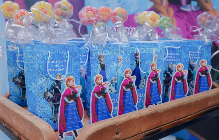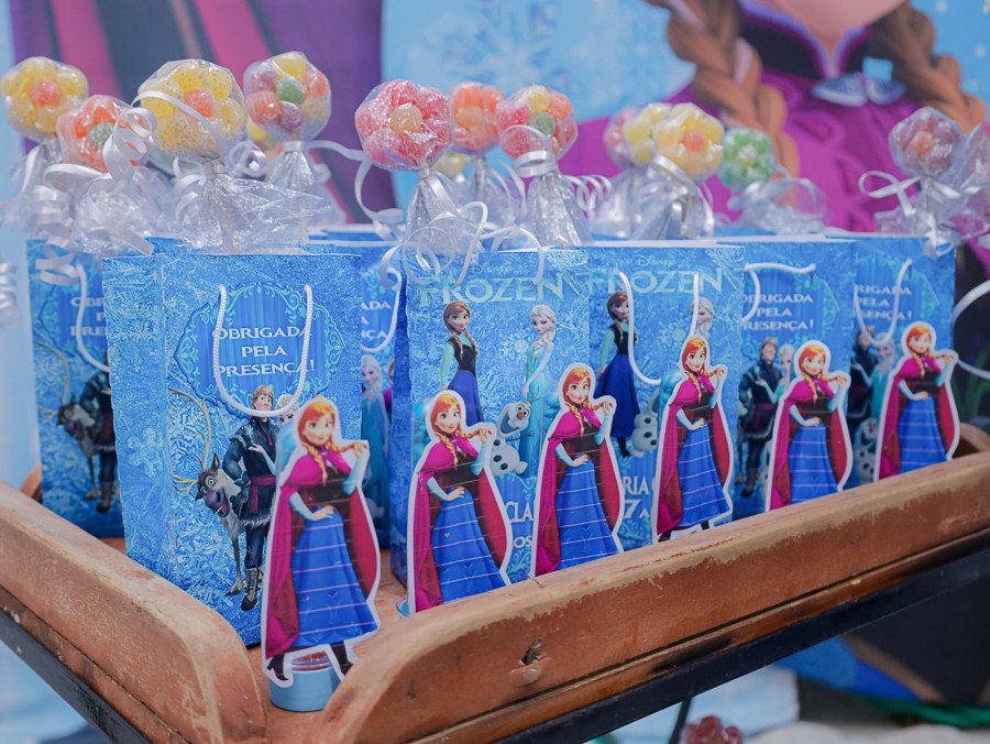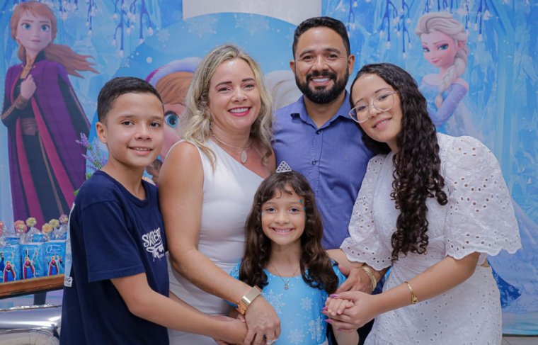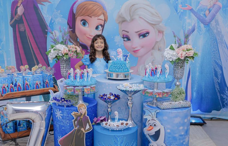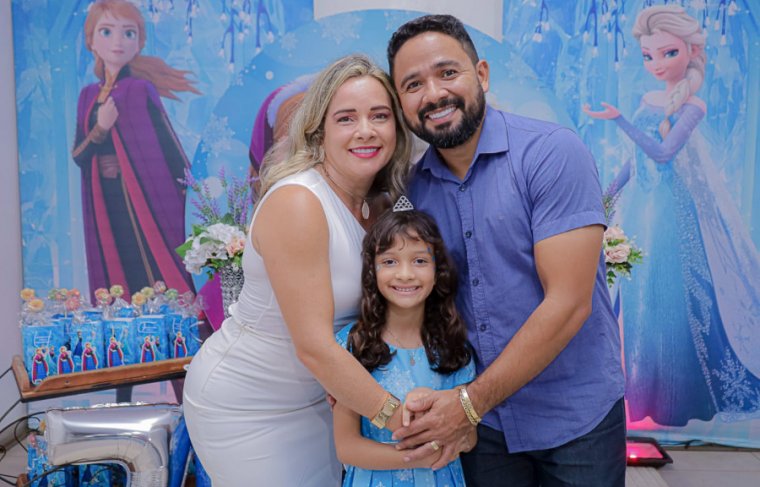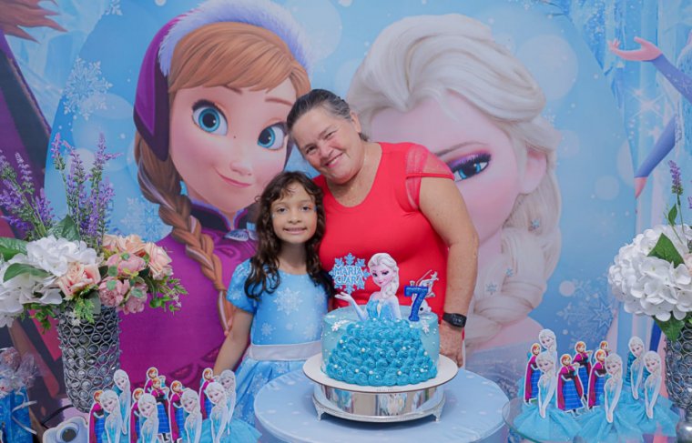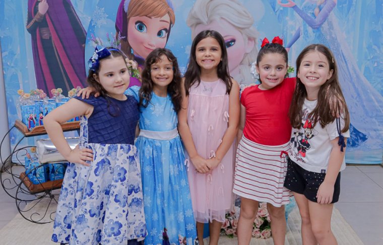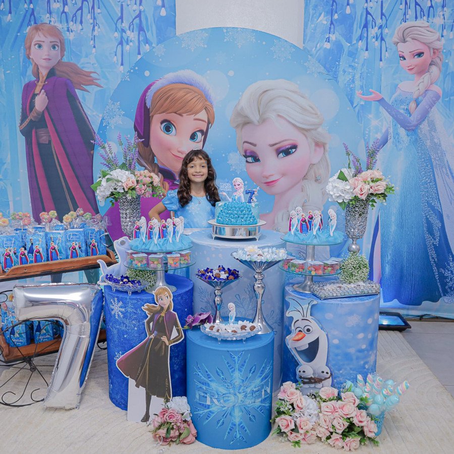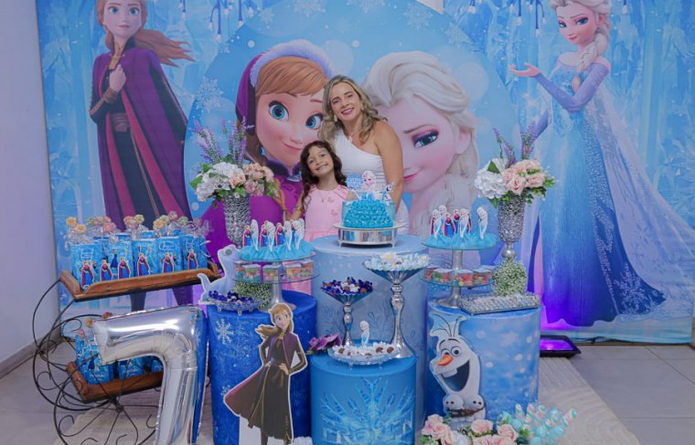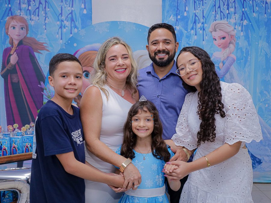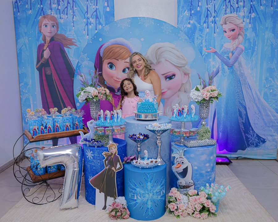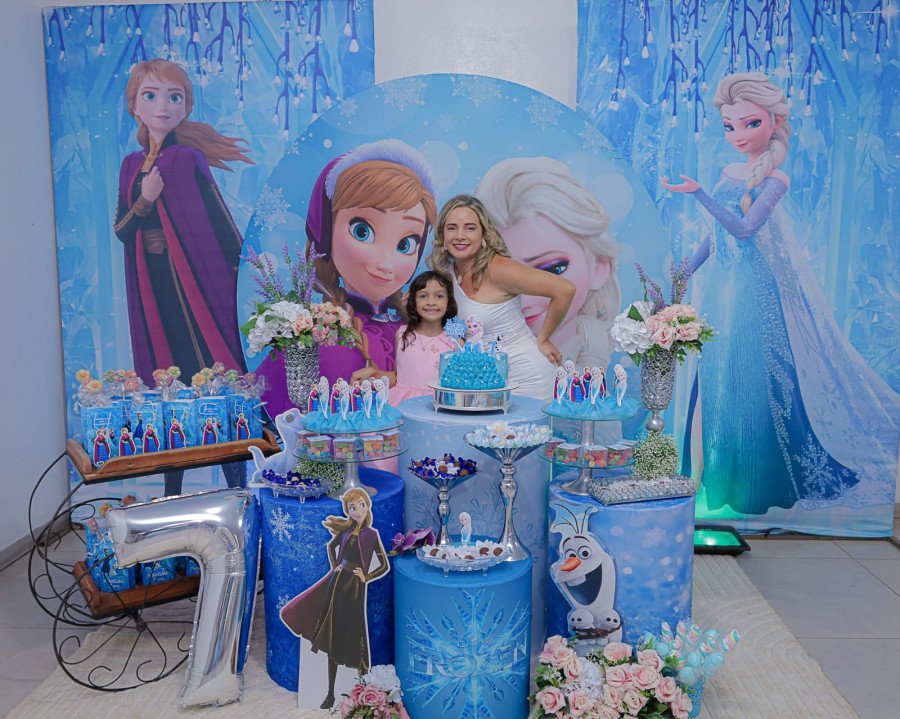 Inspirada no universo de Frozen, a pequena surgiu deslumbrante, como uma autêntica princesa de Arendelle. O look escolhido? Um longo azul impecável, salpicado de flocos de neve e com as icônicas personagens do filme adornando o barrado. Para completar a produção digna de realeza, Maria Clara usou uma mimosa coroa.