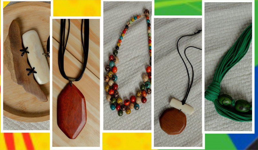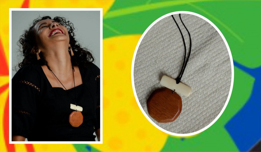- Jaqueline Cardoso, usa os colares: em couro sintético, madeira e osso bovino, terminal em disco de coco da praia e outro confeccionado com couro sintético, osso bovino e madeira