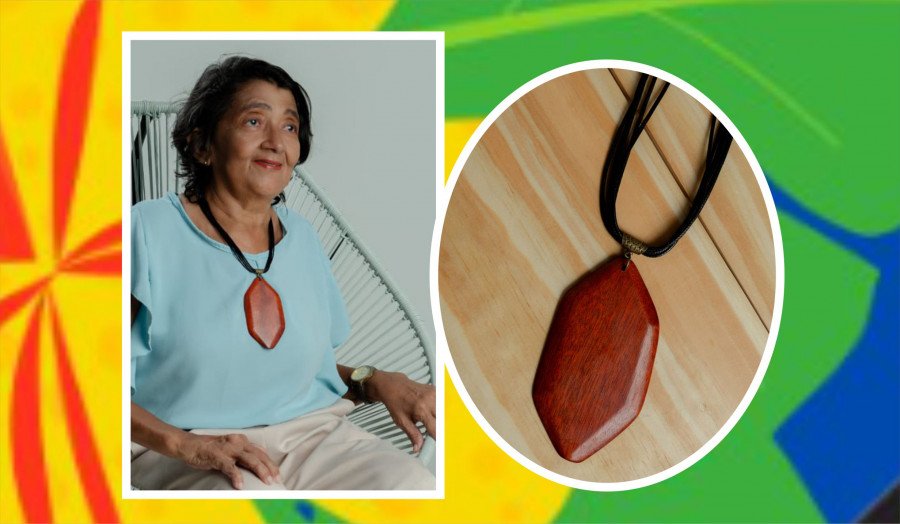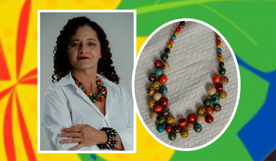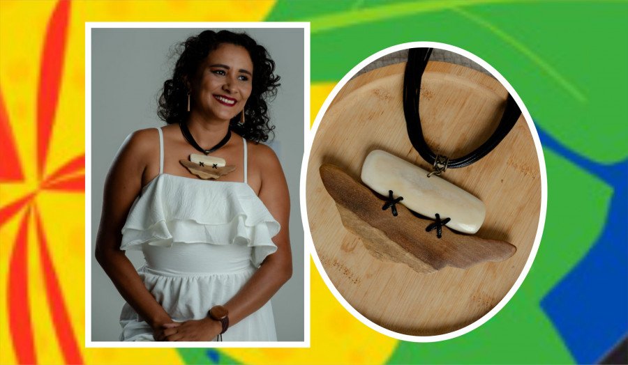 - Ivanete Hipólito usa colar confeccionado com açaí, paxiubão e terminal em disco de coco da praia