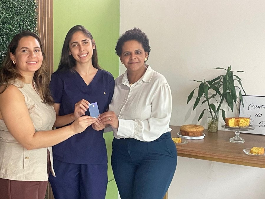 A Gerente Exclusiva Donas do Negócio Sicredi, Ag. José de Brito, Áudila Pereira (à esq.), entrega o prêmio à empresária, Denize (à dir), Doceria Denize Cakes e a cliente, Victória Abreu (enfermeira).