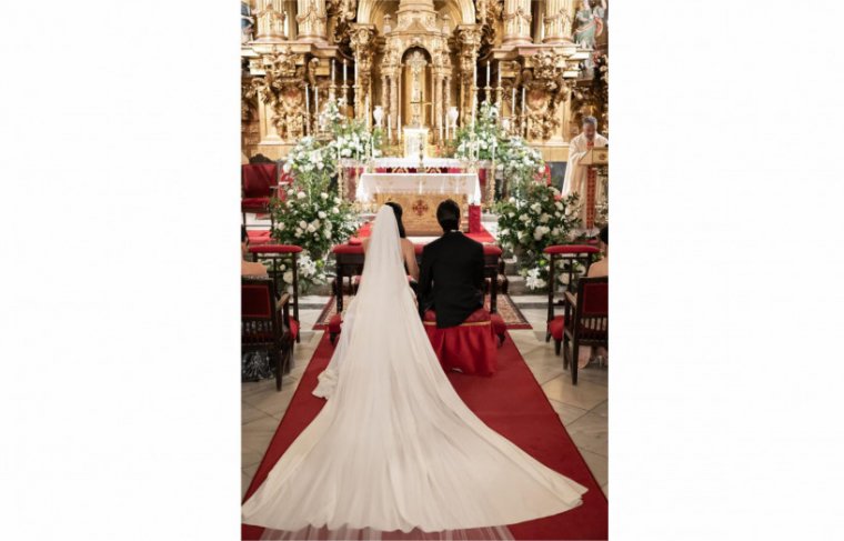 Um tomara-que-caia com drapeado no busto, sobreposto por uma sobressaia etérea que ampliava a elegância do modelo sereia em seda pura. O véu tradicional, longo e esvoaçante, caía suavemente sob o cabelo impecável, criando uma aura clássica e atemporal. Nas mãos, um bouquet cascata branca de orquídeas e antúrios completava o visual, simbolizando o amor, força e emoções que transbordam. As orquídeas representam luxo e delicadeza; os antúrios, paixão e proteção. Juntos, criam um arranjo imponente, vivo e absolutamente inesquecível.