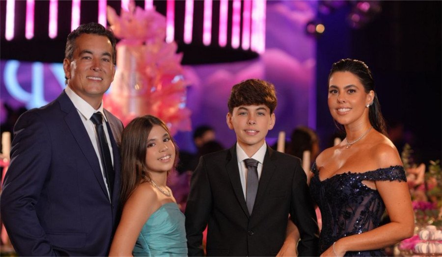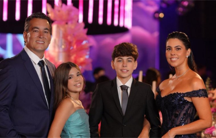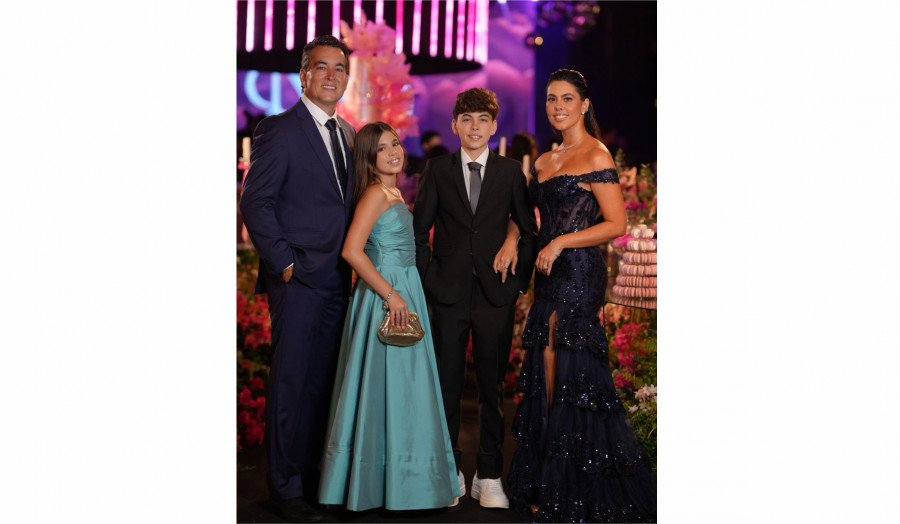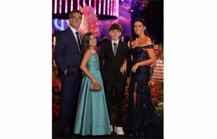 Ao lado do marido, Matheus Costa Guidi, e dos filhos, Artur e Bibi, Marcela formou um dos grupos mais elegantes e sintonizados da festa. Tim-Tim!