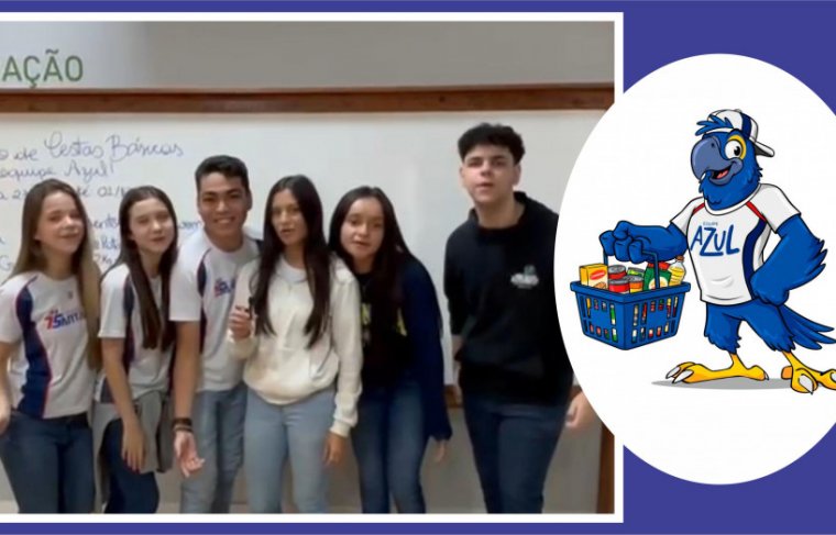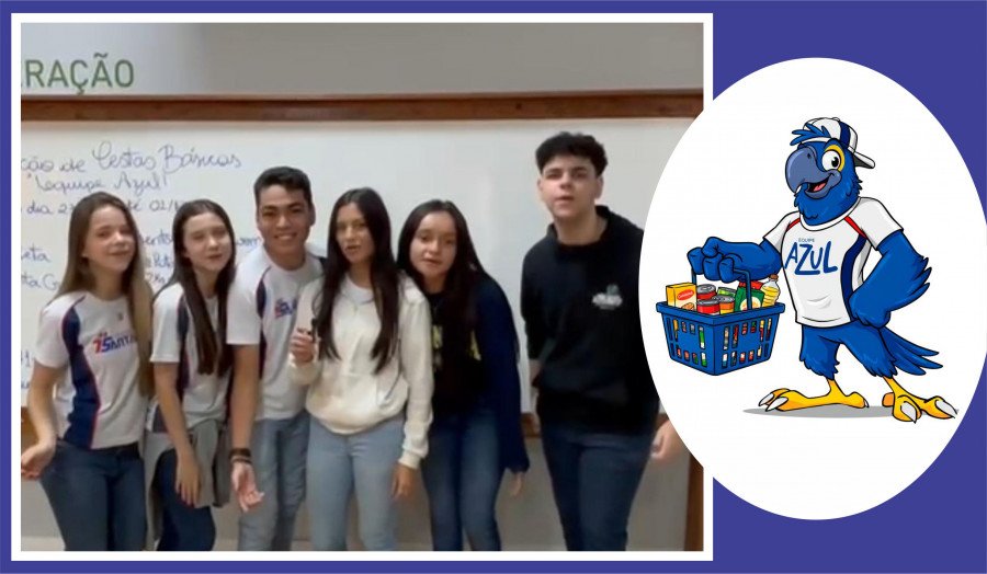 Os Azuis no retrato: Emerson Dias Júnior, Maria Vitória, Marina Benavente, Rafaelle Rezende, Myrella Ribeiro e Egídio Nunes, fizeram reuniões para debater estratégias, definir quais alimentos deveriam conter na cesta básica. Competindo e trabalhando com propósito, engajados na gincana. Com apoio das empresas. Cheiro de Amor, Simone Calçados, Tubarão Esportes, Paula Confecções, Celulândia, Feirão dos calçados, Trovette store e Wolf Wear