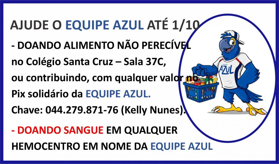 Entregue sua doação de alimentos não perecíveis no Colégio Santa Cruz – Sala 37C, de 23/09 a 01/10, ou contribua, doando qualquer valor no Pix do time Azul Solidário. Chave: 044.279.871-76 (Kelly Nunes). Na doação de sangue em qualquer Hemocentro do Estado, Doe em nome da Equipe Azul.