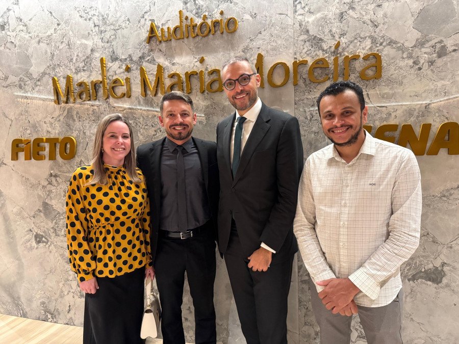 O palestrante e advogado tributarista Alexandre Limiro, mestre em Direito e ex-conselheiro do Conselho Administrativo de Recursos Fiscais (CARF), posa para a CCMNC ao lado dos proprietários do Hospital de Olhos de Araguaína, Dr. João Arraes e Dra. Tatiana Arraes, e do mestre de cerimônias e diretor-secretário da A Associação Comercial e Industrial de Araguaína - ACIARA, Itamar de Oliveira Pereira, durante o coquetel do Observatório da Reforma Tributária, realizado na noite de quinta-feira, em 29 de janeiro, no Auditório Marlei Moreira, na Federação da Industria do Estado do Tocantins -FIETO, em Araguaína.